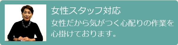 女性スタッフがお客様のご事情を十分配慮し、細かい心配り作業で対応させていただきます。